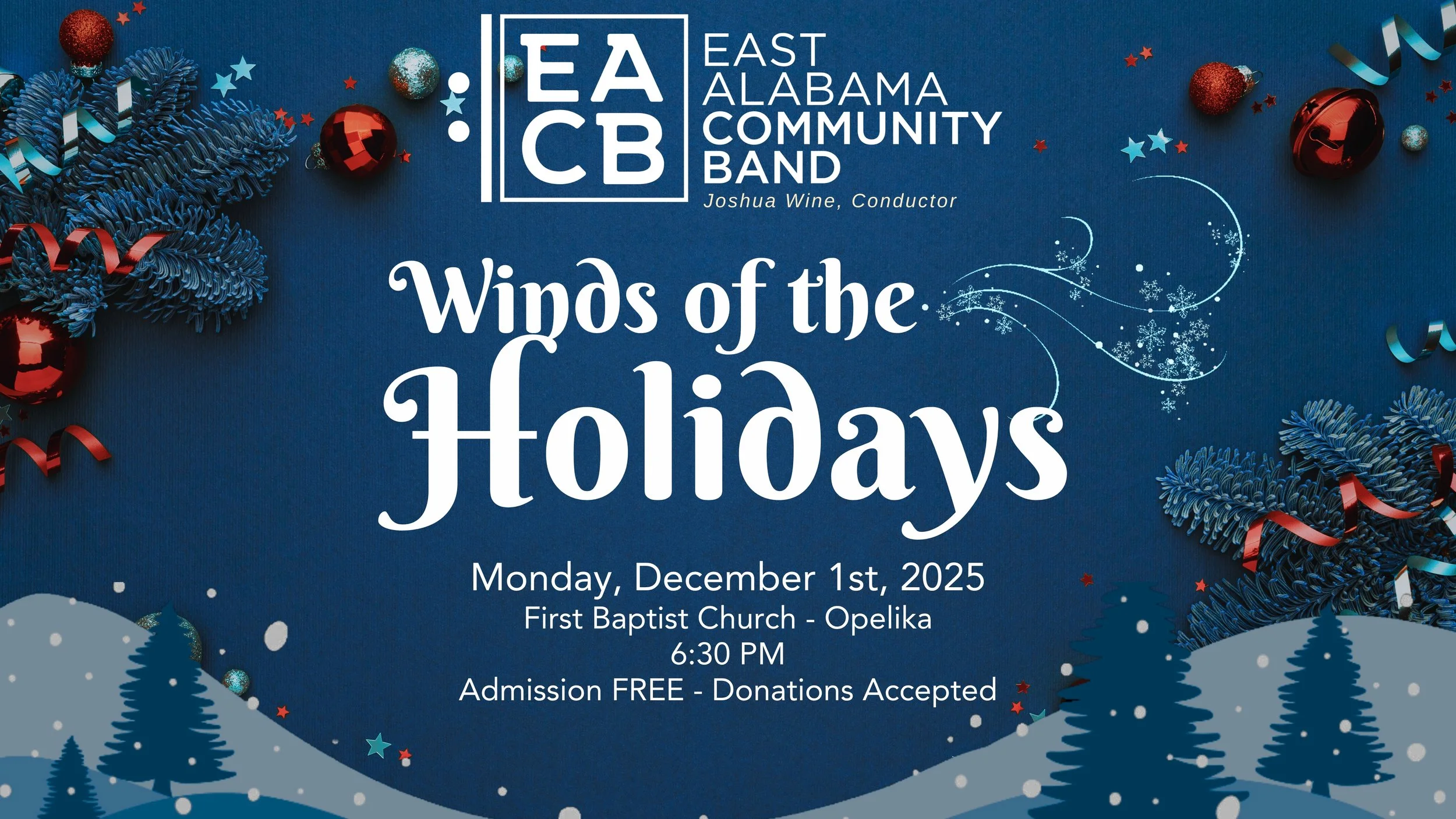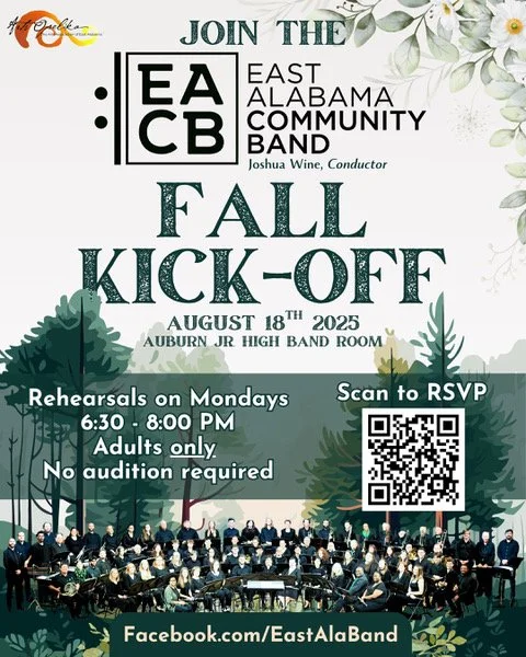 Founded in 2012 by Mrs. Mary Slaton, the East Alabama Community Band is an adult community band that rehearses weekly on Monday evenings in the band room at Auburn Jr. High School, 405 South Dean Road, from 6:30 to 8:00 PM. The band is directed and conducted by Mr. Joshua Wine, a local-area band director & music educator.